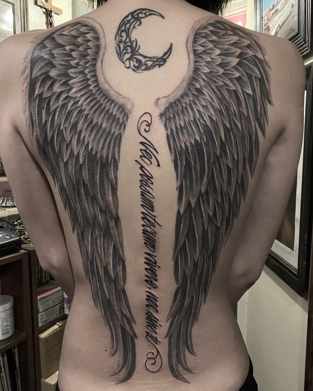 悠莉(ゆうり)さんの美しい背中一面に広がる翼のタトゥー。「それより見てよこの広背筋!」とツイートされており、タトゥーをより映えさせるために筋トレに励んでるのかも?