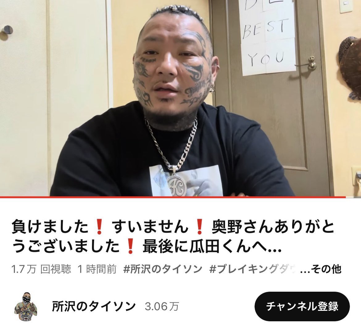 - 「なんでこういう裏切り者が多いのかなって。内藤裕、お前から大関(タイソンチャンネルメンバー)に合わせたいって言ってきたんだろ?悪いけど所沢のタイソンの兄弟分として最後の義理を通させてもらうよ、自分もバックはいるんで」